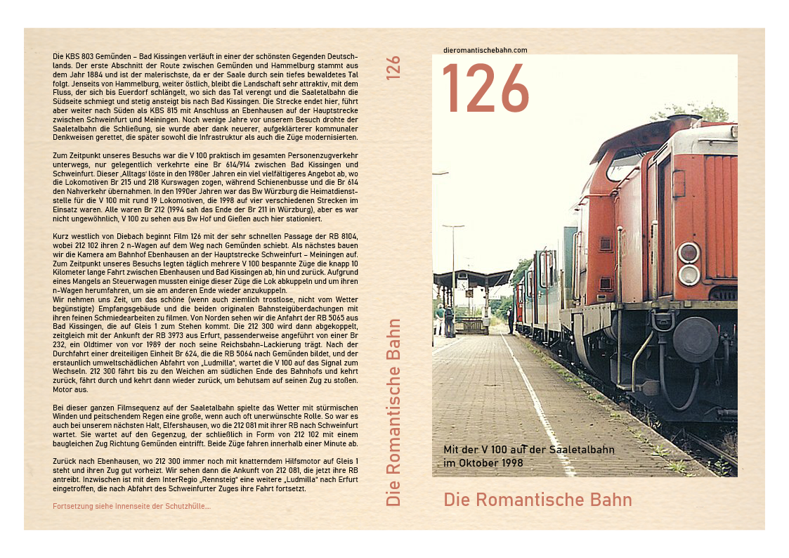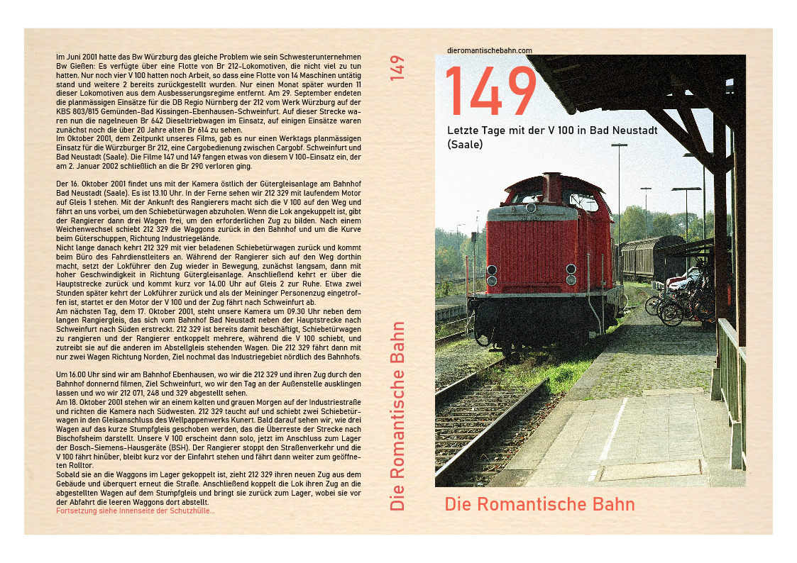 …..Die Dreharbeiten beginnen am warmen Herbstnachmittag des 15. Oktober 2001 im Bahnhof Bad Neustadt (Saale). Es ist 15.30 Uhr und am Bahnhof ist es ruhig, die Passagiere treffen bereits zum nächsten Zug nach Meiningen ein. Drüben auf Gleis 4 steht ein Zug Schiebetürwagen mit 212 329 an der Spitze. Es ist der CB 61085. Der Lokführer kommt, springt in den Führerstand und nachdem er die Bremsen des Zuges gelöst hat, drűckt den Starterknopf, der den Motor zum Leben erweckt…..