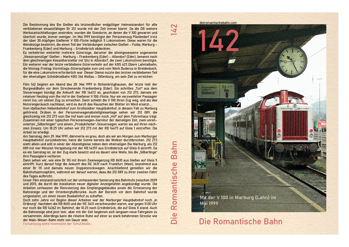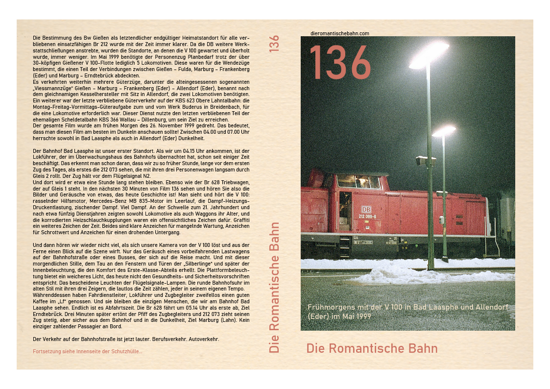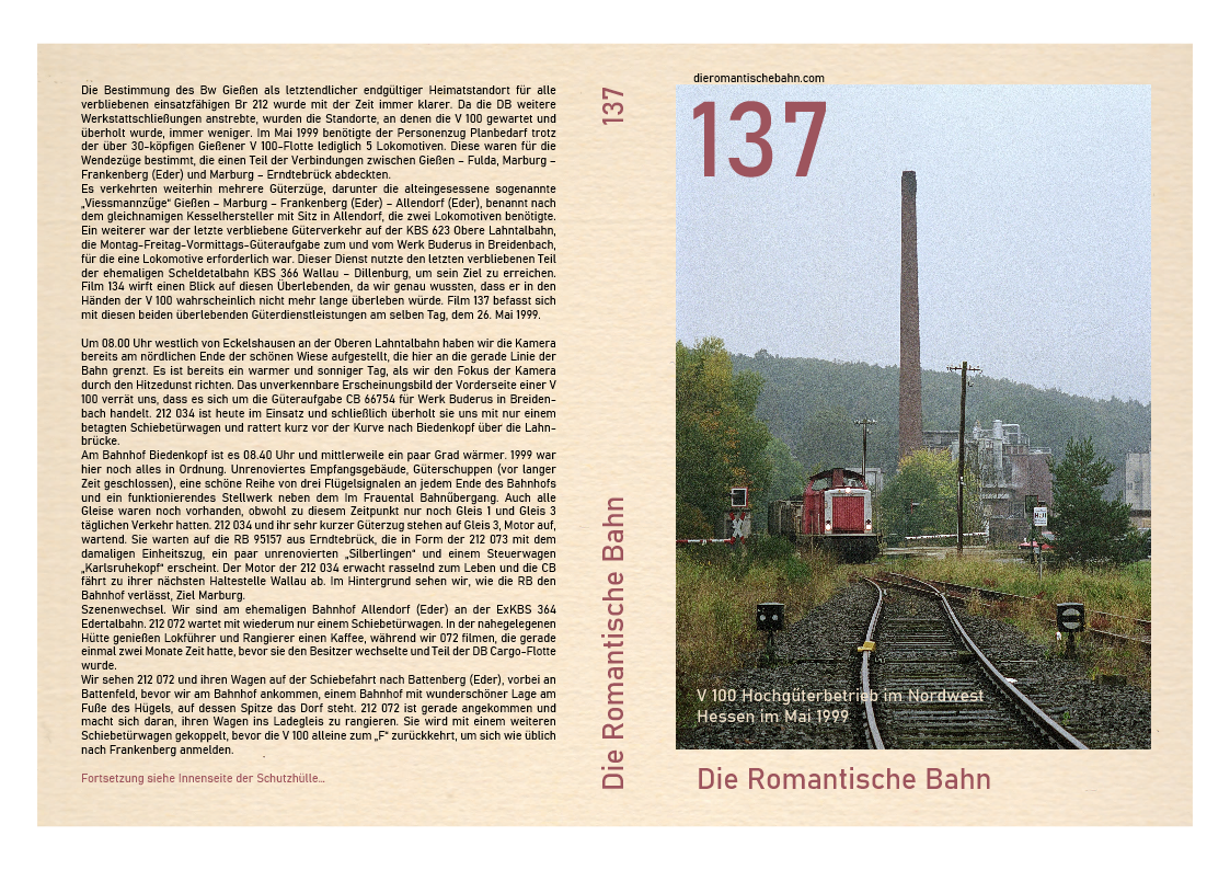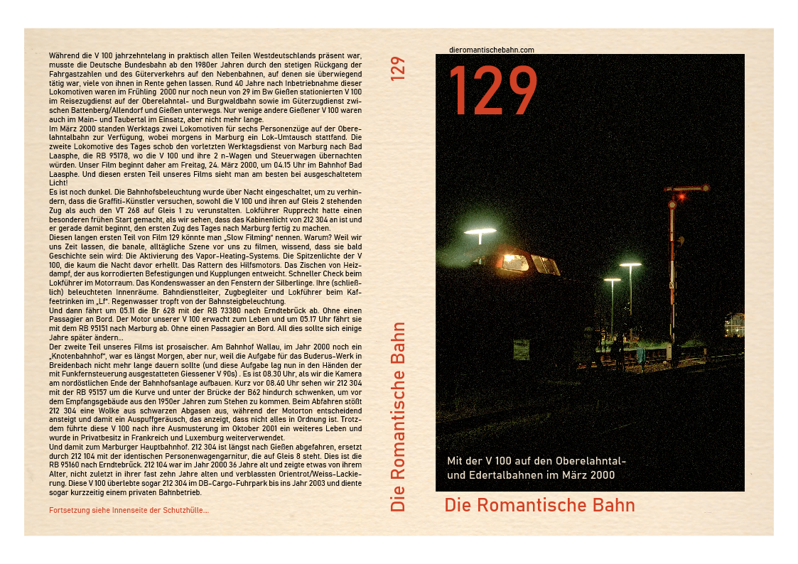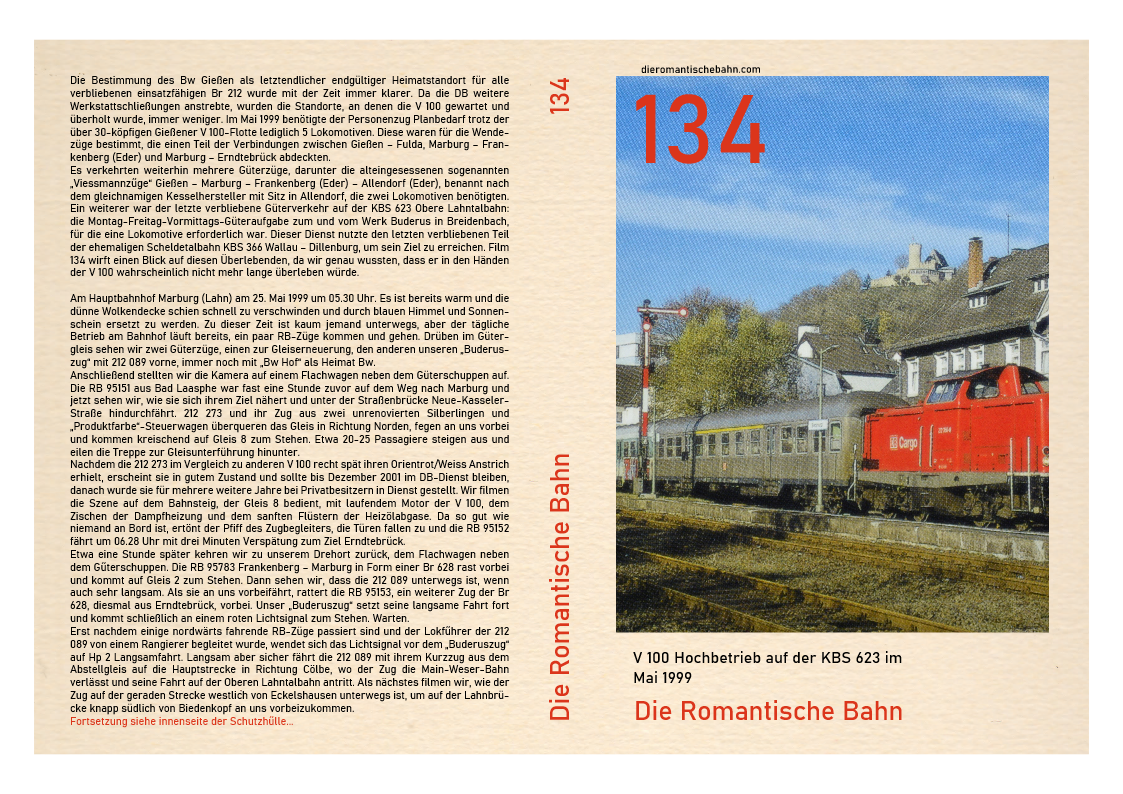 …..Dieser Film wurde an einem Ort, dem Marburger Hauptbahnhof, gedreht und zeigt nur eine V 100, 212 259. Diese Lokomotive wurde im April 1965 beim Bw Hamburg-Harburg in Dienst gestellt und beendete ihre 31-jährige Karriere beim Bw Gießen im Jahr 2001, nachdem sie von Bw Würzburg im Februar 1999 versetzt worden war. Nachdem die 212 259 fast ein Jahr lang stillgelegt und in einer immer länger werdenden Reihe ausgemusterter Dieselloks im Bw Gießen gestanden hatte, wechselte sie zur ALS Stendal und wurde 2008 komplett umgebaut…..