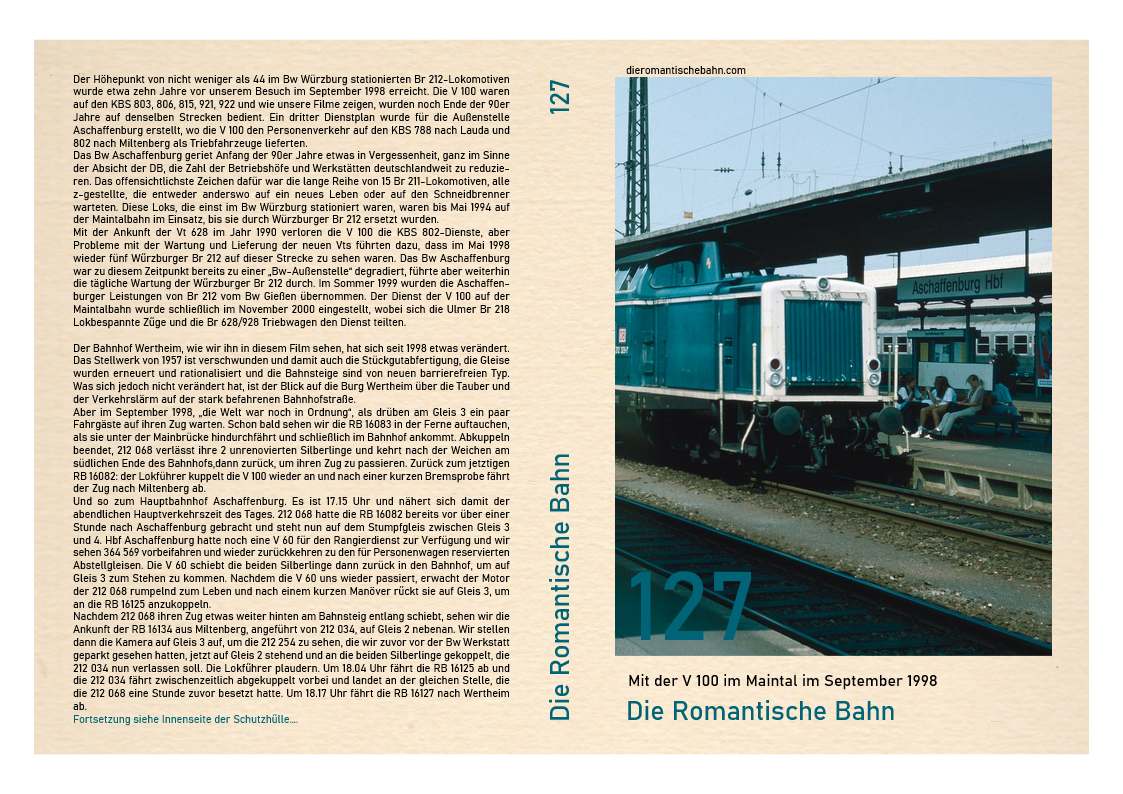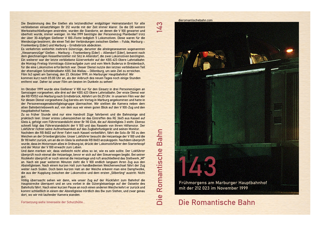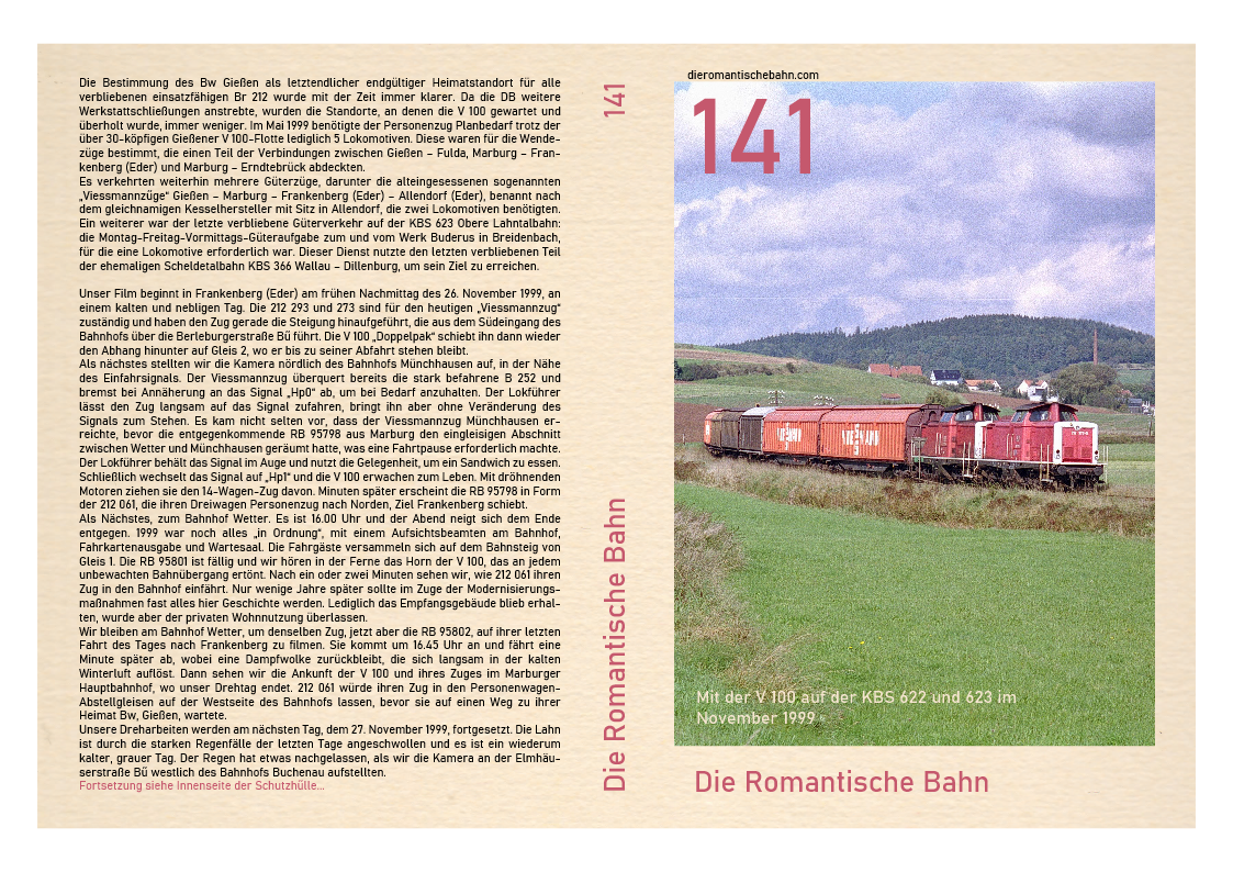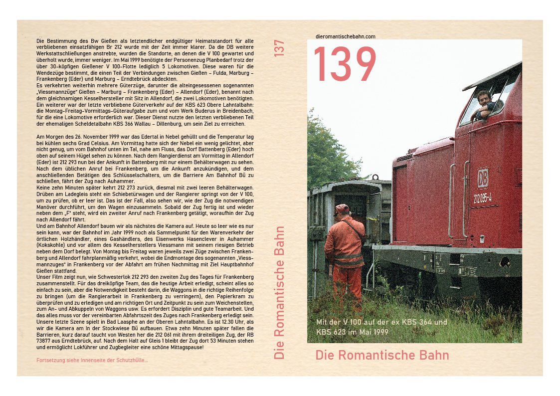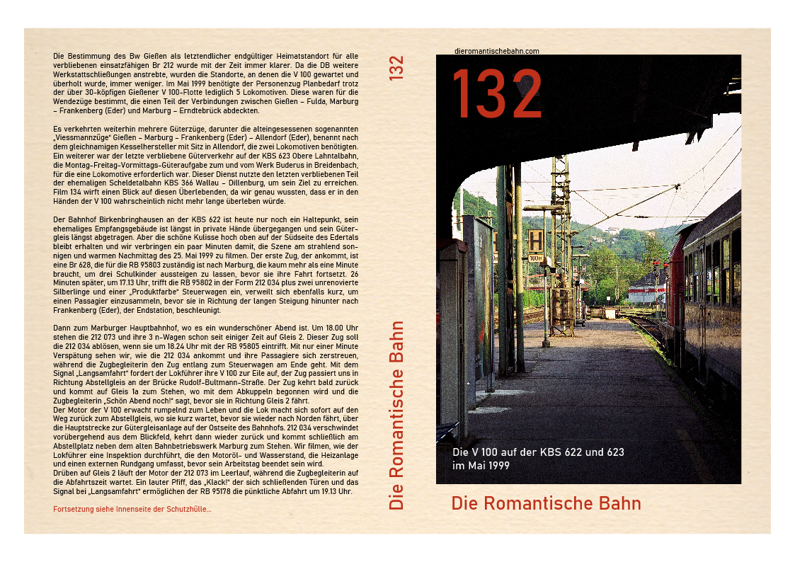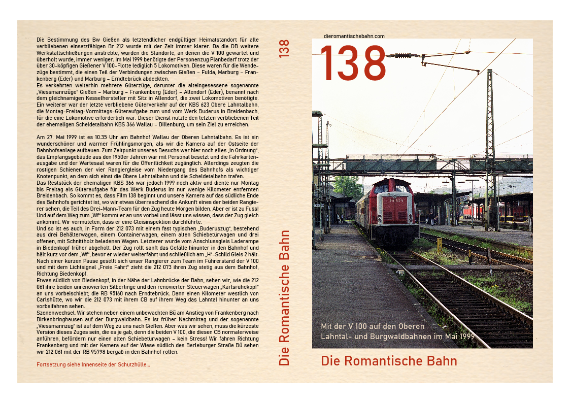 …..Dieser Film wurde an einem Ort, dem Marburger Hauptbahnhof, gedreht und zeigt nur eine V 100, 212 259. Diese Lokomotive wurde im April 1965 beim Bw Hamburg-Harburg in Dienst gestellt und beendete ihre 31-jährige Karriere beim Bw Gießen im Jahr 2001, nachdem sie von Bw Würzburg im Februar 1999 versetzt worden war. Nachdem die 212 259 fast ein Jahr lang stillgelegt und in einer immer länger werdenden Reihe ausgemusterter Dieselloks im Bw Gießen gestanden hatte, wechselte sie zur ALS Stendal und wurde 2008 komplett umgebaut…..