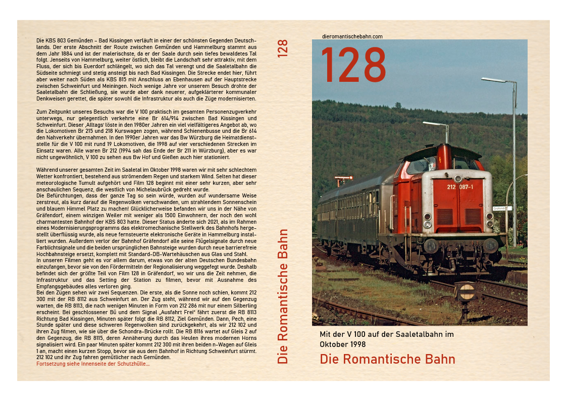 ……In unseren Filmen geht es vor allem darum, etwas von der alten Deutschen Bundesbahn einzufangen, bevor sie von den Fördermitteln der Regionalisierung weggefegt wurde. Deshalb befindet sich der größte Teil von Film 128 in Gräfendorf, wo wir uns die Zeit nehmen, die Infrastruktur und das Setting der Station zu filmen, bevor mit Ausnahme des Empfangsgebäudes alles verloren ging…..