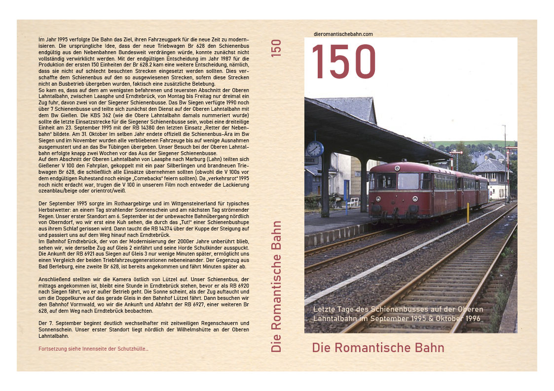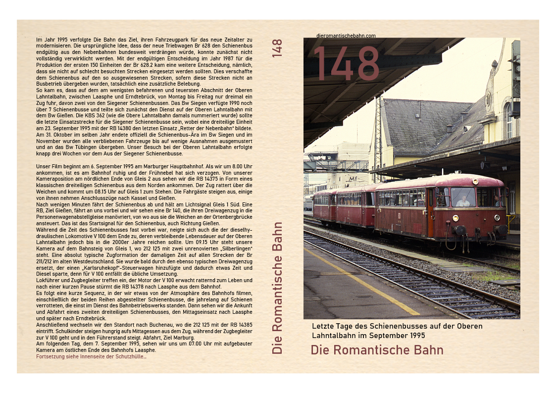 …So kam es, dass auf dem am wenigsten befahrenen und teuersten Abschnitt der Oberen Lahntalbahn, zwischen Laasphe und Erndtebrück, von Montag bis Freitag nur dreimal ein Zug fuhr, davon zwei von den Siegener Schienenbussen. Das Bw Siegen verfügte 1990 noch über 7 Schienenbusse und teilte sich zunächst den Dienst auf der Oberen Lahntalbahn mit dem Bw Gießen. Die KBS 362 (wie die Obere Lahntalbahn damals nummeriert wurde) sollte die letzte Einsatzstrecke für die Siegener Schienenbusse sein….