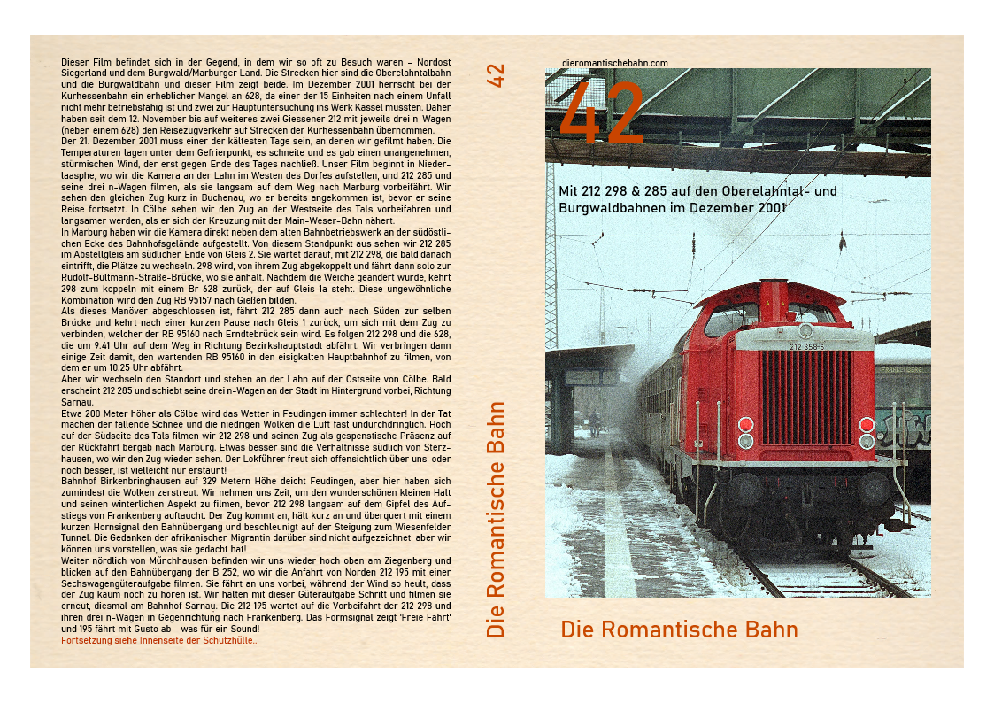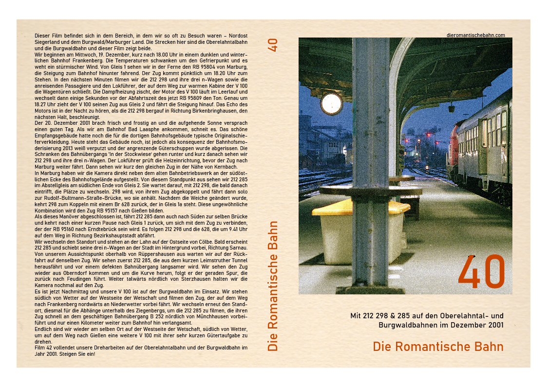 ….Ein paar Minuten spät, schiebt 212 298 den Zug aus dem Bahnhof und die Kamera zoomt heraus, um einen Verkehrsrot Br 628 zu sehen, der in Gleis 2 steht und bald nach Frankenberg fährt. Nur wenige Wochen später sollten diese Fahrzeuge die V 100 aus dem Personenverkehr im Raum Marburg ausbauen. Aber nicht für immer. Das letzte Leben der V 100 wurde hier im Jahr 2002 gepachtet....