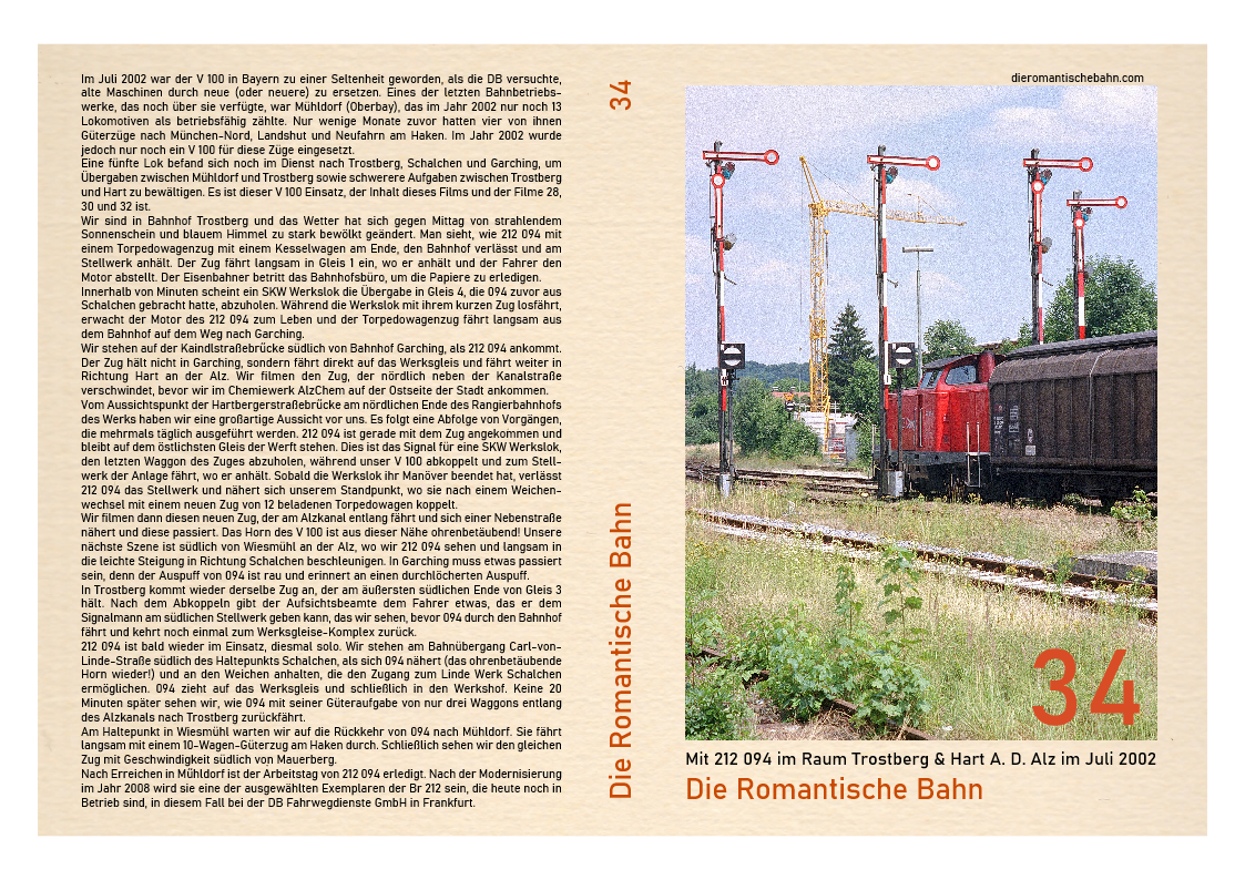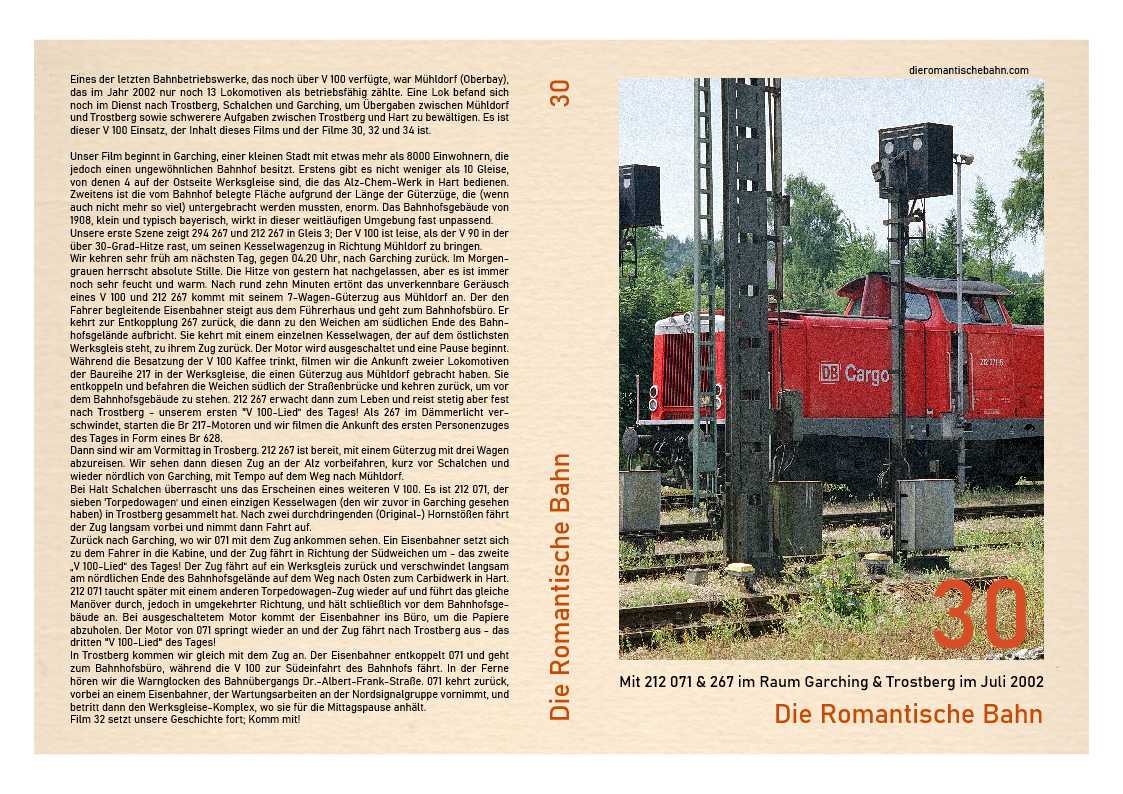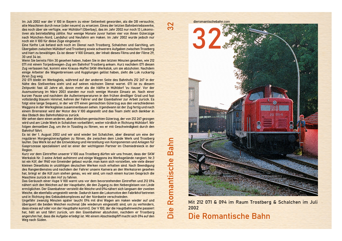 …..Es ist Montag, 29. Juli 2002, 05.10 Uhr im Bahnhof Trostberg. Es ist schon warm und feucht in der Luft, die Temperatur liegt bereits in den niedrigen 20ern. Die Morgendämmerung ist angebrochen und beleuchtet zu dieser Tageszeit eine verlassene und friedliche Szene. Dieser Frieden wird durch die Ankunft von 212 267 aus Mühldorf mit seiner Vierwagen-Übergabe gestört. Der Motor geht aus und der Eisenbahner kommt, um den Lokführer zu begrüßen. Nach dem Abkuppeln erwacht der Motor von 267 wieder zum Leben und die 32-jährige Lokomotive fährt alleine zum südlichen Ende des Bahnhofsbereichs……