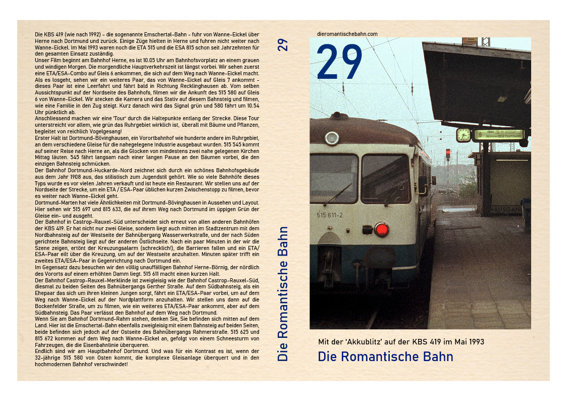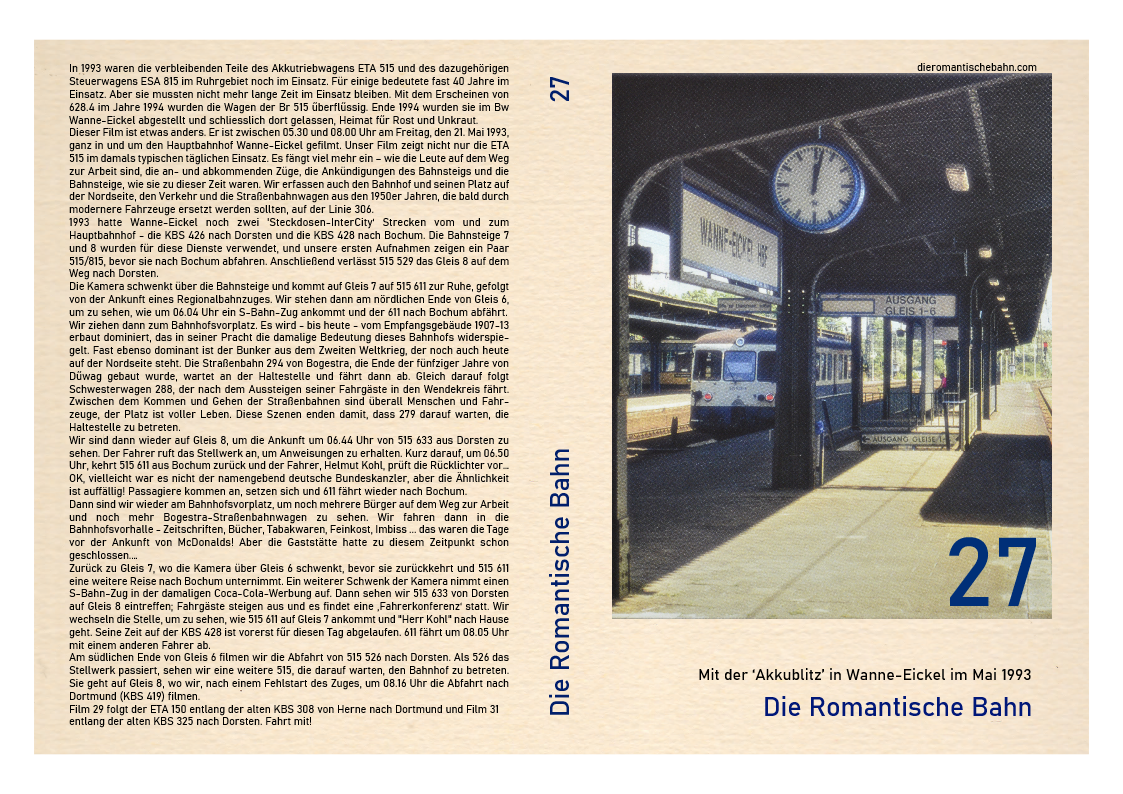 …..Dieser Film ist etwas anders. Es ist zwischen 05.30 und 08.00 Uhr am Freitag, den 21. Mai 1993. Unser Film zeigt ganz in und um den Hauptbahnhof Wanne-Eickel, nicht nur die ETA 515 im damals typischen täglichen Einsatz. Es fängt viel mehr ein – wie die Leute auf dem Weg zur Arbeit sind, die an- und abkommenden Züge, die Ankündigungen des Bahnsteigs und die Bahnsteige, wie sie zu dieser Zeit waren. Wir erfassen auch den Bahnhof und seinen Platz auf der Nordseite, den Verkehr und die Straßenbahnwagen aus den 1950er Jahren, die bald durch modernere Fahrzeuge ersetzt werden sollten, auf der Linie 306……