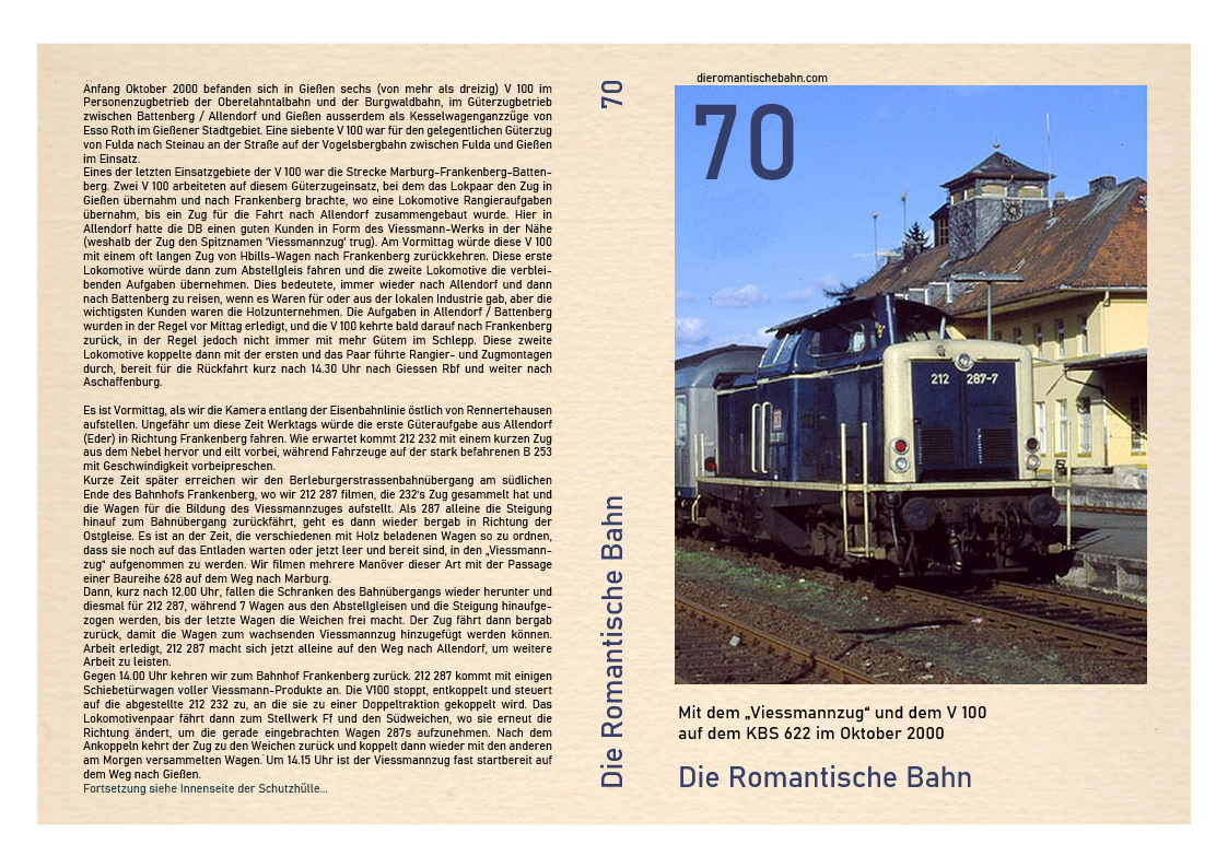 …..Am 25. August 2000 stehen wir am südlichen Ende des Bahnhofsgelände von Frankenberg (Eder). Es ist 05.15 Uhr und noch dunkel. Man hört gelegentliches Hundegebell, um den Frieden zu stören. Aber in der Ferne können wir bereits das unverkennbare Geräusch eines herannahenden Schwerlastgűterzuges hören. Die Glocken des Berleburgerstraße Bahnűbergang läuten und die großen Schranken schwingen nach unten und sichern die Überfahrt. Das ferne Dröhnen des Zuges ist vorübergehend verschwunden, als er das Gefälle von Birkenbringhausen (329 m überm Meer) nach Frankenberg (269 m) hinunterrollt, kommt aber bald mit starkem Bremsmanöver des Zuges zurück, als er sich dem Bahnhof nähert……