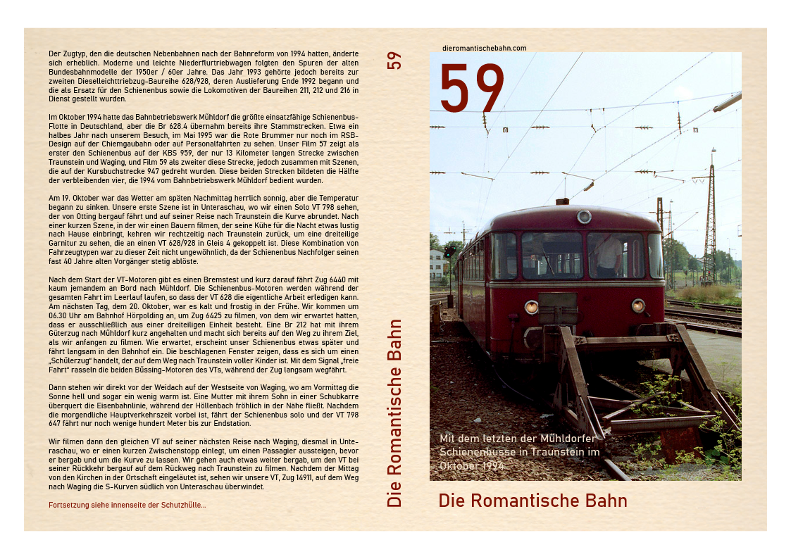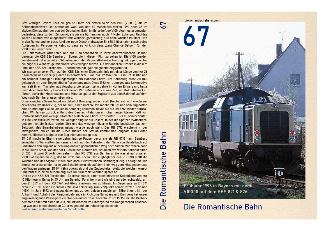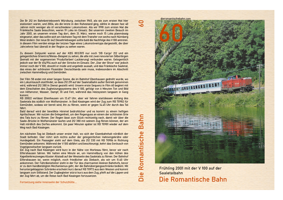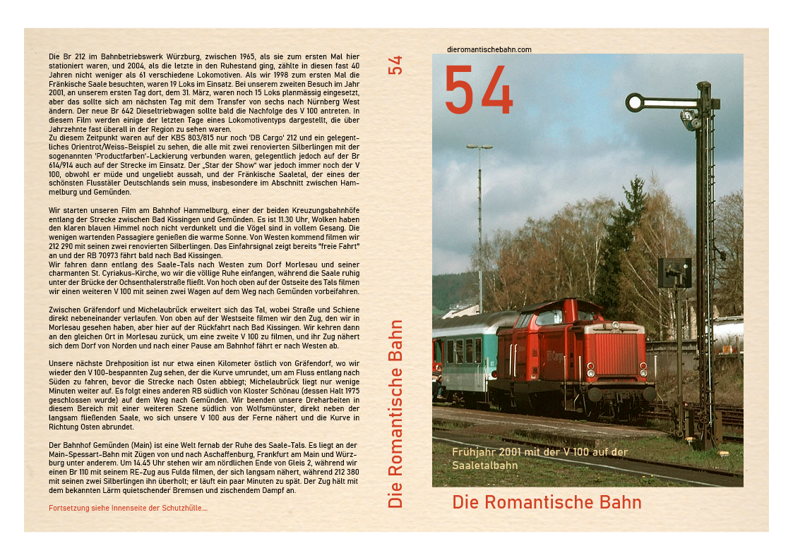 ….Nächster Halt ist Michelau. Dieses kleine Dorf mit rund 150 Einwohnern lag zwischen den steilen Talseiten und wirkte während der Dreharbeiten nicht überraschend verlassen. Die Fränkische Saale fließt langsam an der kleinen Bahnhaltestelle „Michelaubrűck“ hoch oben am Nordufer vorbei. Schließlich wird der Frieden durch die Ankunft und Abfahrt von RB 70972, bestehend aus 212 065 und zwei renovierter Silberlingen, auf seiner Reise nach Geműnden gestört…..