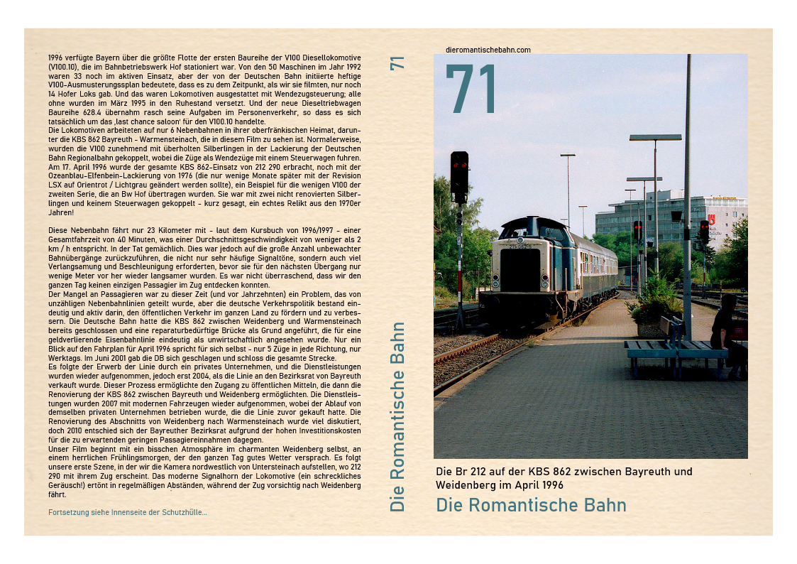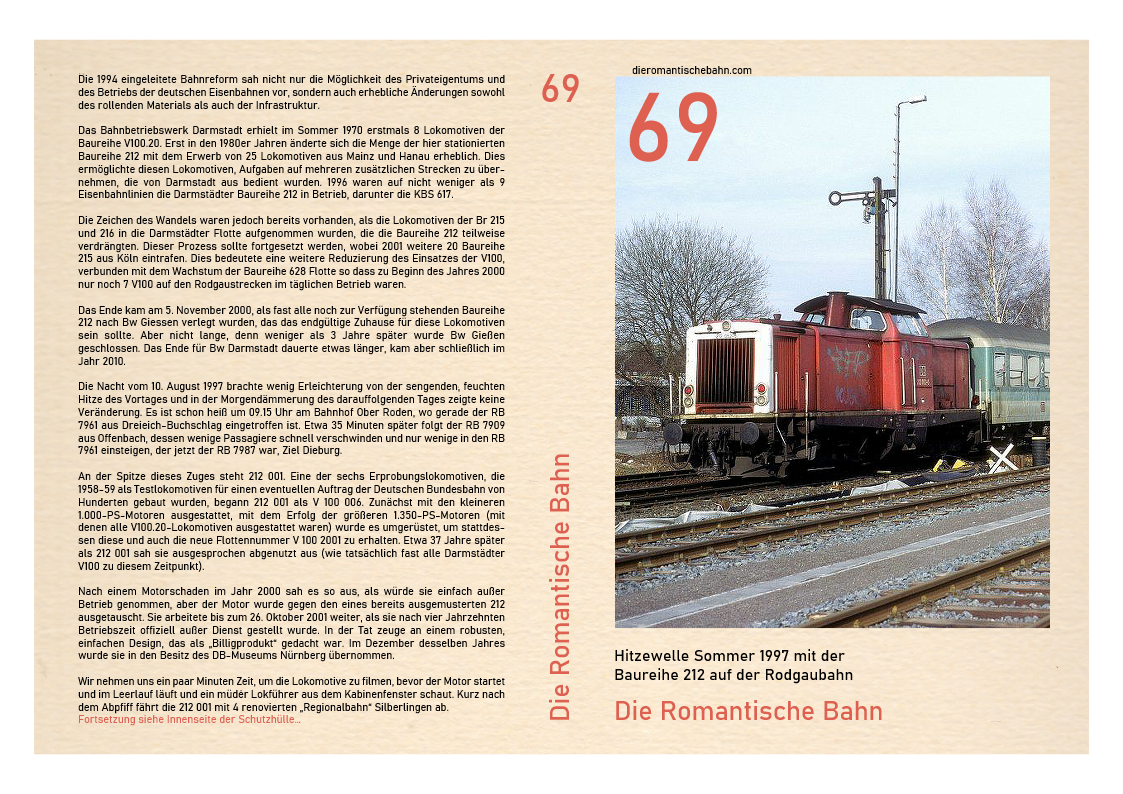 …..An der Spitze dieses Zuges steht 212 001. Eine der sechs Erprobungslokomotiven, die 1958-59 als Testlokomotiven für einen eventuellen Auftrag der Deutschen Bundesbahn von Hunderten gebaut wurden, begann 212 001 als V 100 006. Zunächst mit den kleineren 1.000-PS-Motoren ausgestattet, mit dem Erfolg der größeren 1.350-PS-Motoren (mit denen alle V100.20-Lokomotiven ausgestattet waren) wurde es umgerüstet, um stattdessen diese und auch die neue Flottennummer V 100 2001 zu erhalten. Etwa 37 Jahre später als 212 001 sah sie ausgesprochen abgenutzt aus (wie tatsächlich fast alle Darmstädter V 100 zu diesem Zeitpunkt)……