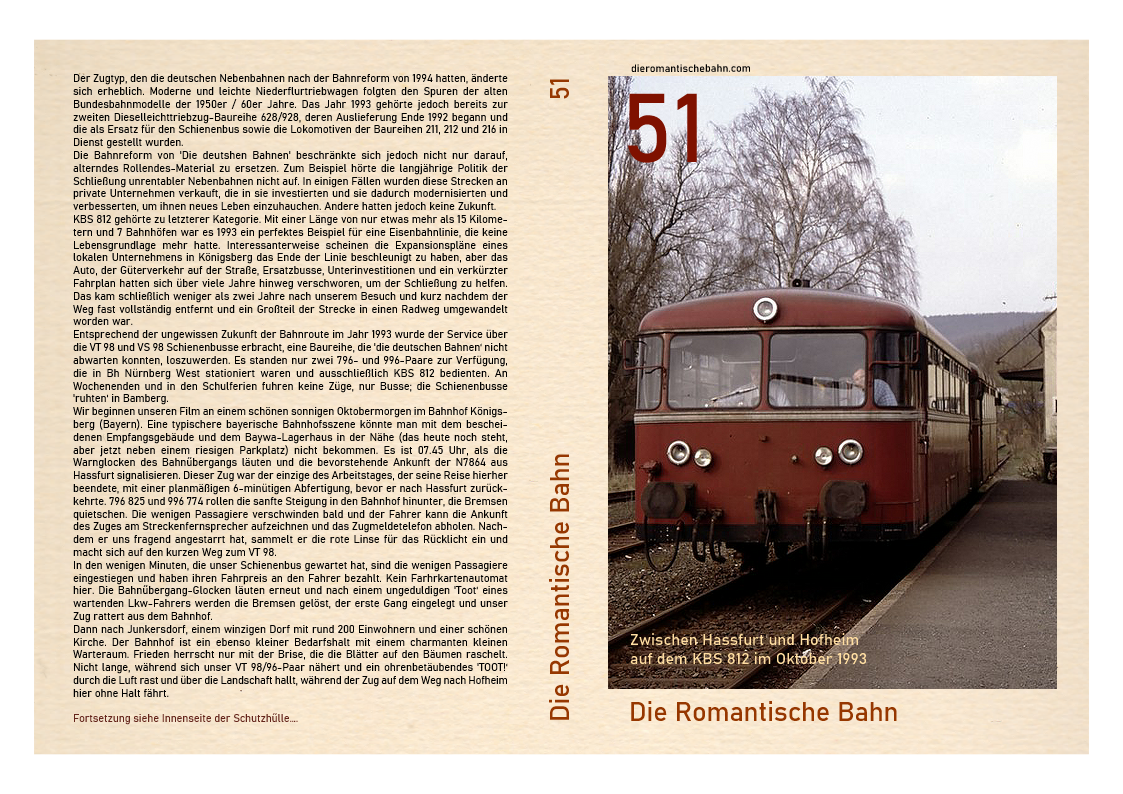 …..Wir fahren zurück entlang des Baunach-Tals, um am charmanten kleinen Halt von Rentweinsdorf, nur wenige Kilometer südlich von Ebern, anzuhalten . Hier zu sein bedeutet, in eine Zeit zurückzutreten, die weniger eilig ist als unsere, in der die Spatzen zwitschern, gelegentlich ein Traktor vorbeifährt und das winzige hölzerne Bahnhofsgebäude, das zum Zeitpunkt des Eisenbahnbaus gebaut wurde, noch steht. Der RB 8712 erscheint in der Mittagshitze, als er um die Kurve südlich der Station kommt und langsam zum Halten kommt. Niemand steigt in den Zug, niemand steigt aus…..