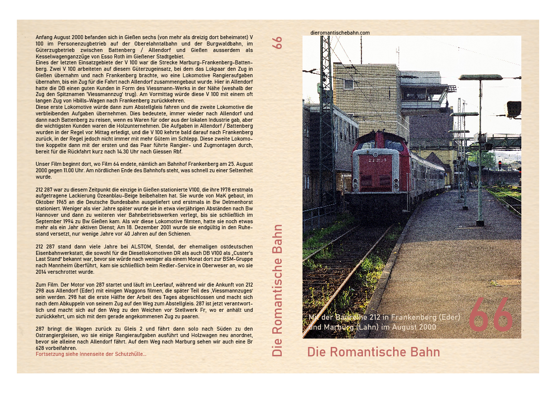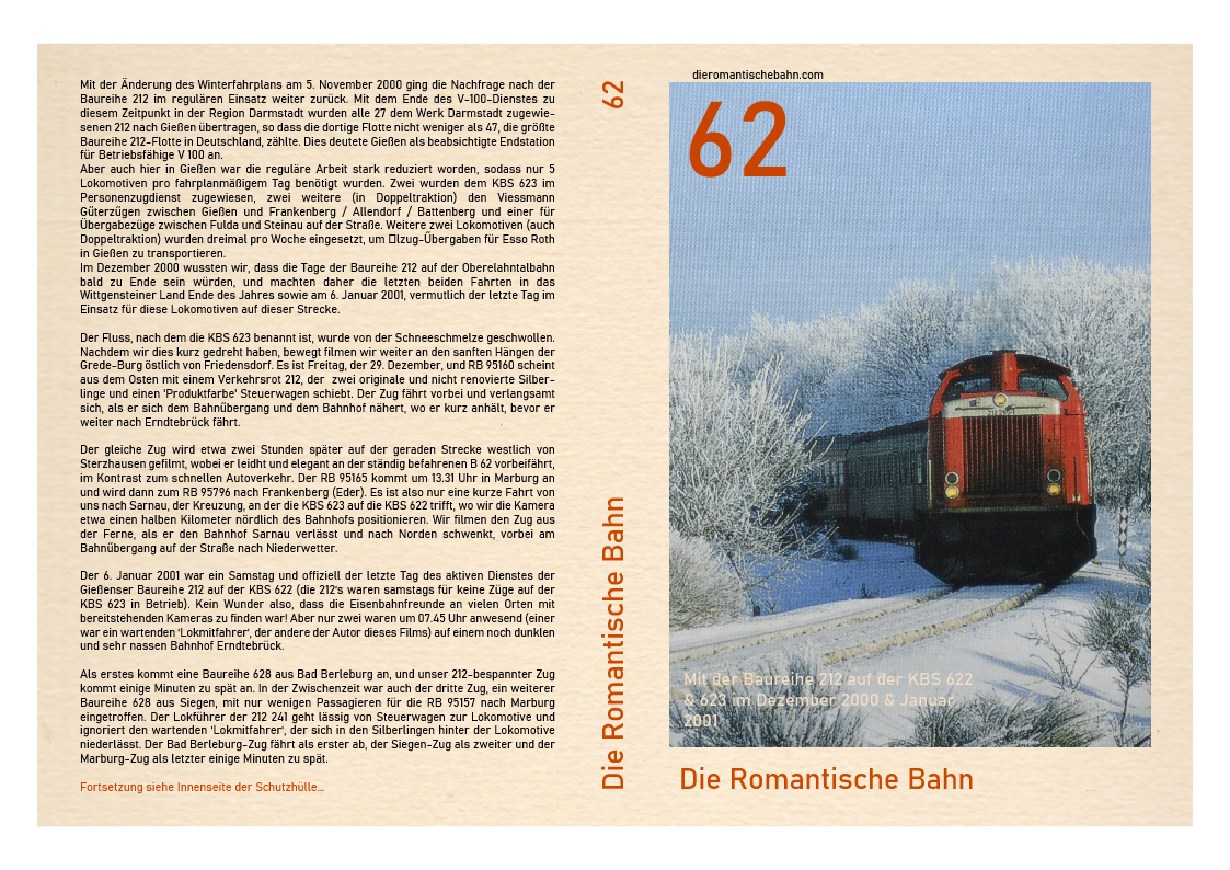 …..Der 6. Januar 2001 war ein Samstag und offiziell der letzte Tag des aktiven Dienstes der Gießenser Baureihe 212 auf der KBS 623 (die 212‘s waren samstags für keine Züge auf der KBS 622 in Betrieb). Kein Wunder also, dass die Eisenbahnfreunde an vielen Orten mit bereitstehenden Kameras zu finden war! Aber nur zwei waren um 07.45 Uhr anwesend (einer war ein wartenden ʻLokmitfahrer‘, der andere der Autor dieses Films) auf einem noch dunklen und sehr nassen Bahnhof Erndtebrück……