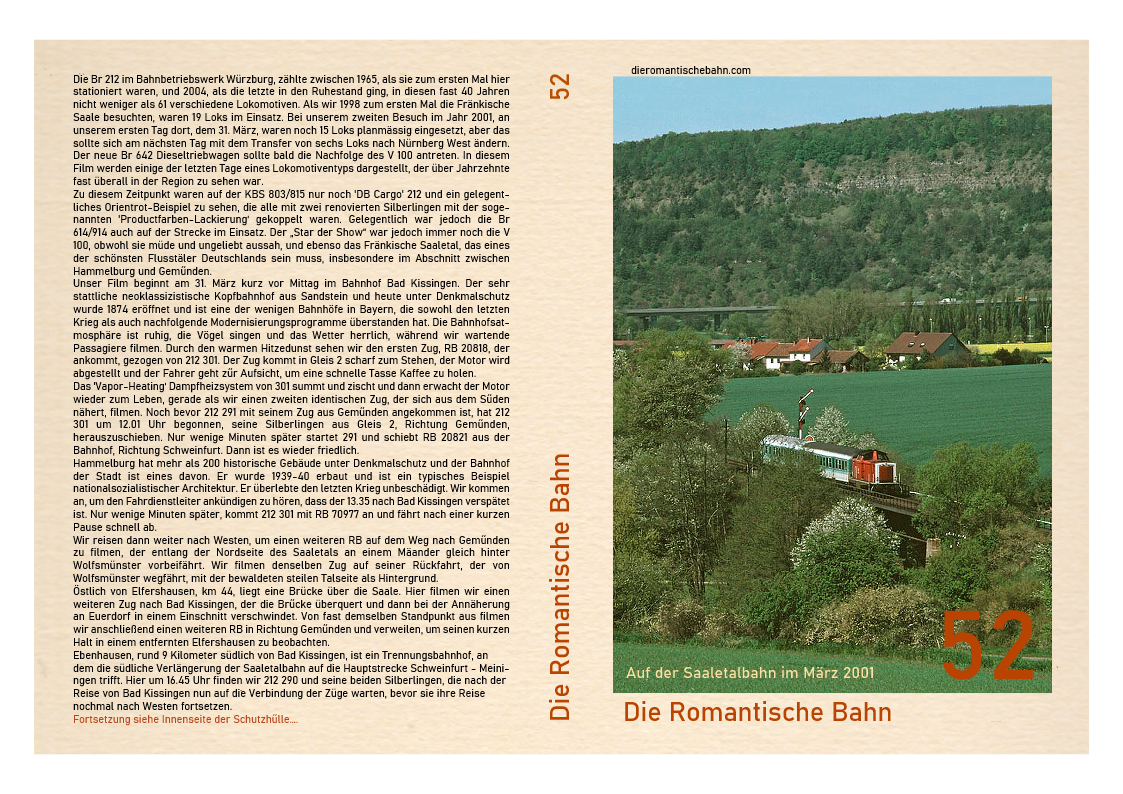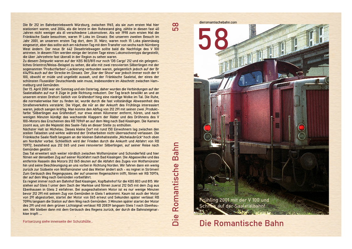…..Unser Film beginnt am 31. März kurz vor Mittag im Bahnhof Bad Kissingen. Der sehr stattliche neoklassizistische Kopfbahnhof aus Sandstein und heute unter Denkmalschutz wurde 1874 eröffnet und ist eine der wenigen Bahnhöfe in Bayern, die sowohl den letzten Krieg als auch nachfolgende Modernisierungsprogramme überstanden hat. Die Bahnhofsatmosphäre ist ruhig, die Vögel singen und das Wetter herrlich, während wir wartende Passagiere filmen. Durch den warmen Hitzedunst sehen wir den ersten Zug, RB 20818, der ankommt, gezogen von 212 301. Der Zug kommt in Gleis 2 scharf zum Stehen, der Motor wird abgestellt und der Fahrer geht zűr Aufsicht, um eine schnelle Tasse Kaffee zu holen……